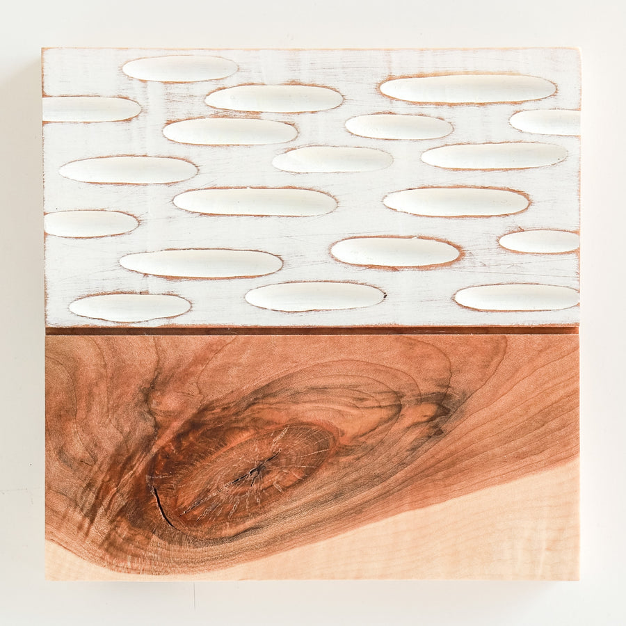 The wood is often worked green then allowed to warp and crack as it dries. After carving he paints or burns the surface to emphasize tool marks. The lines and textures carved in the wood are abstractions from the natural world; rocks, water, sand, waves, trees, ice, etc. Joseph primarily works within squares, rectangles and grids; exploring relationships between the organic carving and the machined lines.
