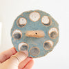 Handmade speckled stoneware incense burner. Glazed with a matte terra sigilatta with a hand-carved design, this dish holds a standard incense stick upright to burn.