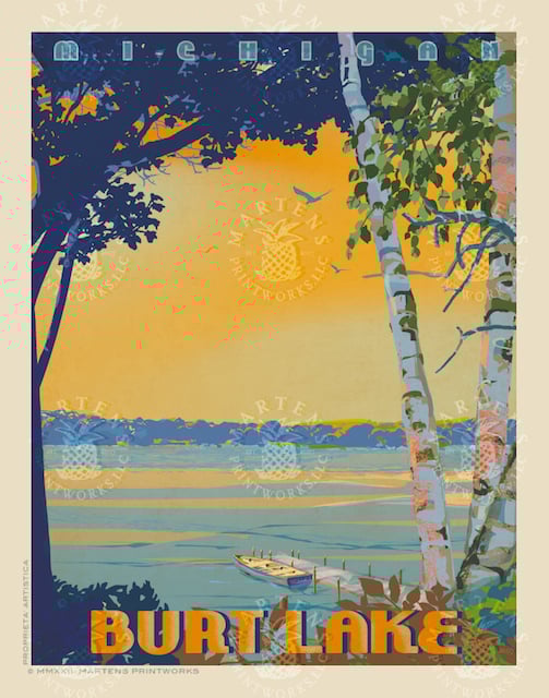 Martens Printworks, LLC. produces original lithographs that are inspired by the subject matter, color and design seen in a foregone era of printmaking. These completely new and original lithographs are a series of works that represent several well-known locations in the grand state of Michigan. They are meticulously printed in Michigan using fine quality, environmentally friendly produced paper and light fast inks.