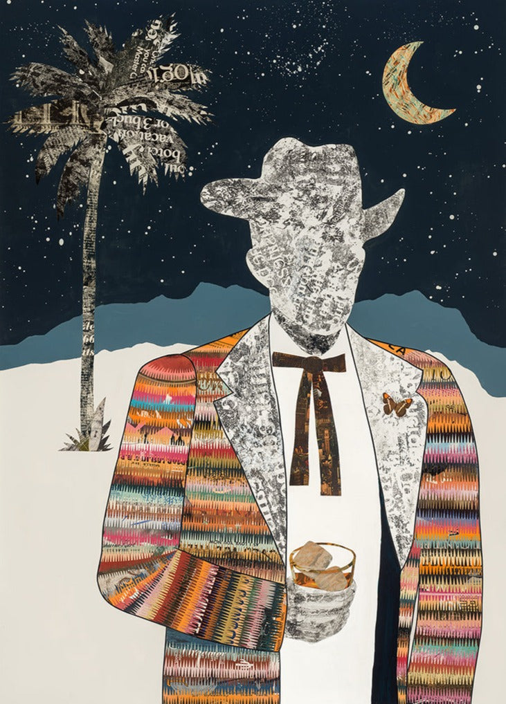 Archival reproduction of original Twilight Cocktail collage painting featuring cowboy gussied up with coat and tie in Southwest moonlight,=.